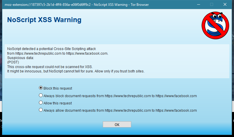NoScript is also a useful tool for developers who want to see how their site functions without JavaScript. It even helps remove frustrating web elements like pop-up messages. The interface can be accessed by either right-clicking on the page or using the dedicated box at the bottom, which displays the URLs blocked.
