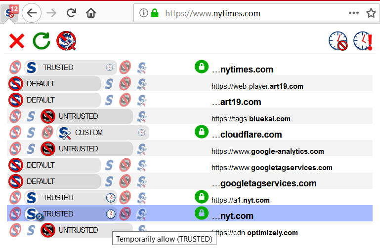 This extension provides an effective way to block trackers, advertisements, and other harmful content. It not only helps increase your privacy and security when surfing the web but also improves page load times by blocking downloads from third-party domains. By default, the active scripts are blocked globally though users get the option to block specific unwanted content.